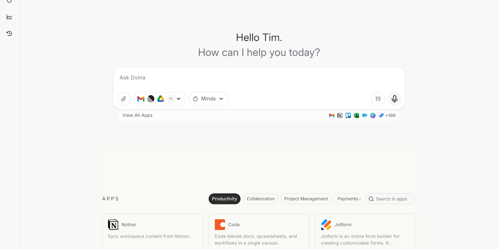 Meet Dvina: World's most connected, private and reliable AI platform. Unified for analyzing, creating and deciding with massive docs, real-time data and 120+ apps like Google, Notion, Linear, Jira, SA