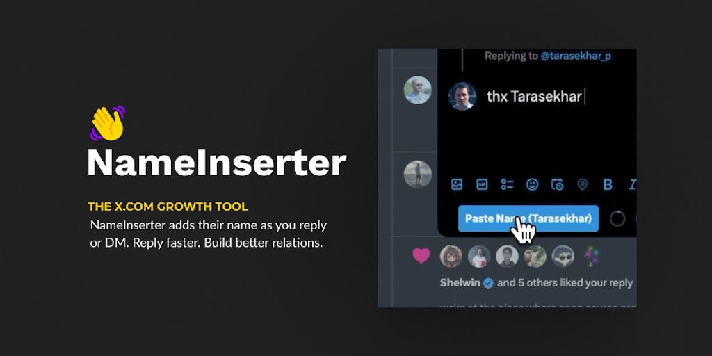 NameInserter adds their name as you reply on X.com It is a 100% free Chrome Extension that instantly adds the first name of a person you are replying to. What for? Mention people by name to build more