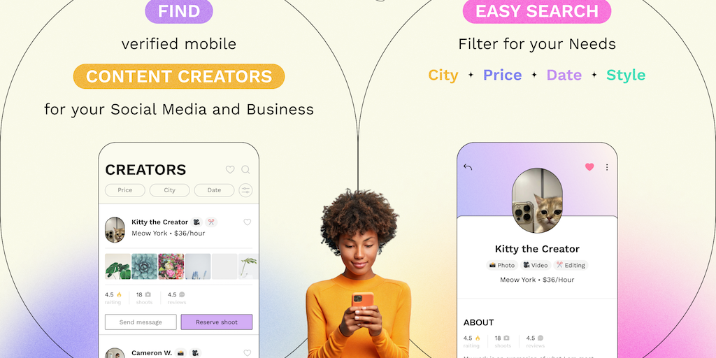 A mobile marketplace app where users can find verified content creators to meet offline and get Pinterest-like photos and trendy videos made on mobile devices for social media