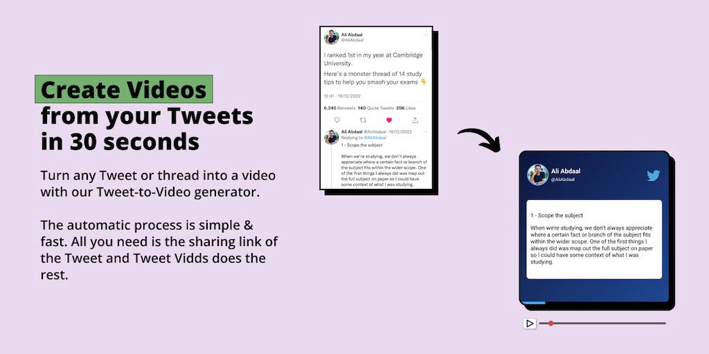 Turn any Tweet or thread into a dynamic video to grow your audience and expand into new ones. Recycle old tweets into videos or repurpose your best Twitter content to share across your other socials.