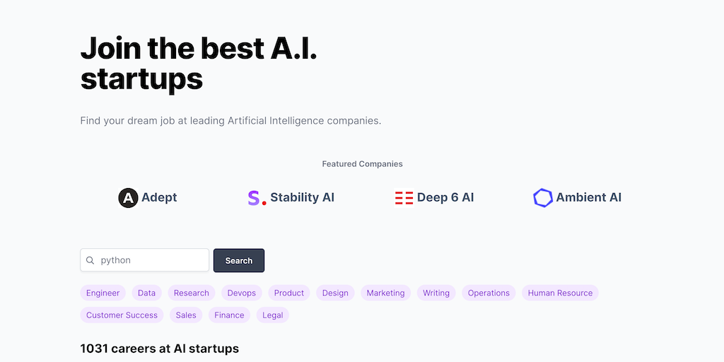A curated list of over a hundred AI-first companies actively hiring for multiple areas.