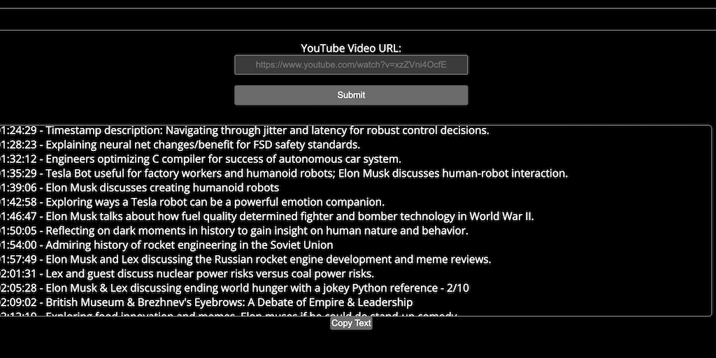 Automatically creates timestamps/chapters for long youtube videos using AI. So users can skip to the content they want to see without having to painfully watch through whole VODS or stream replays.