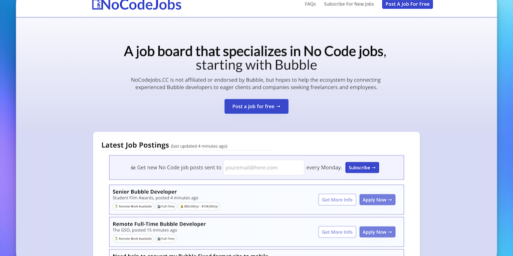 NoCodeJobs.cc - List your no code dev job for free, starting with Bubble | Product Hunt