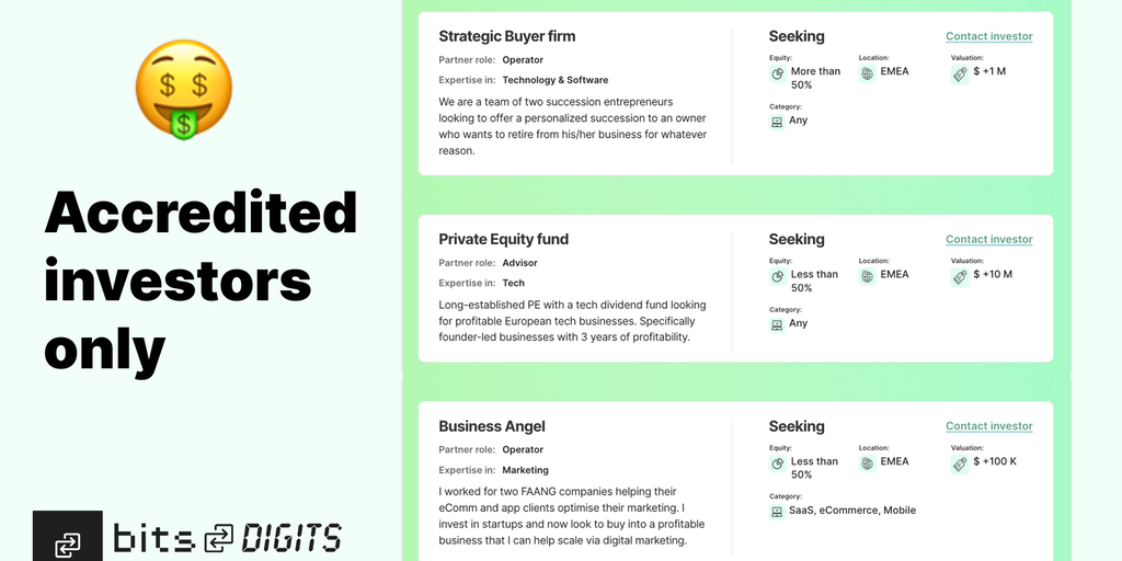 BitsForDigits is the world’s #1 partial buyout marketplace. We make it anonymous, easy and free for founders to sell minority and majority stakes to professional investors. List your business today to