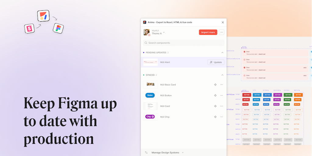 Anima turns your code components in Storybook into a Figma library, and keeps them continuously synced with production code. Code props become Figma variants, CSS turns to AutoLayout, & design tokens