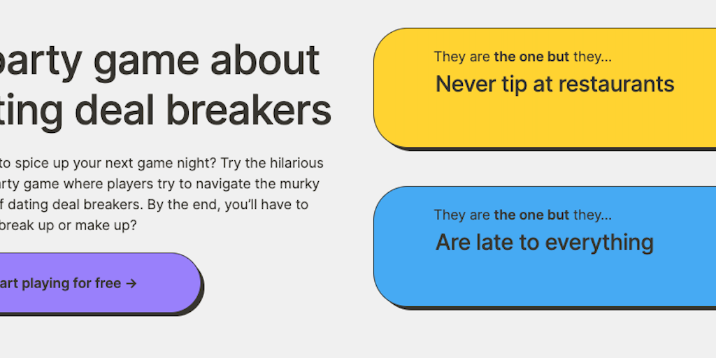 Looking to spice up your next game night? Try the hilarious online party game where players try to navigate the murky waters of dating deal breakers. By the end, you’ll have to choose: break up or mak