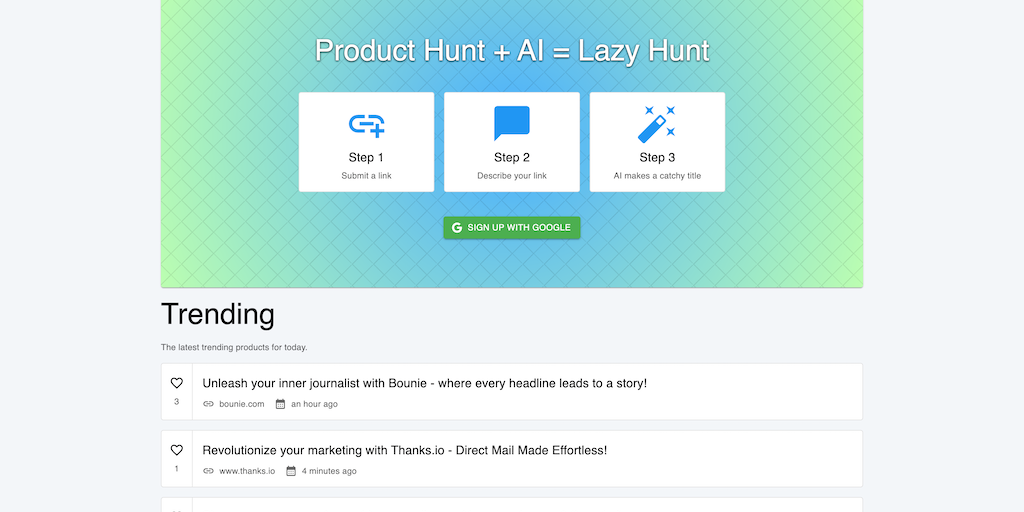 Similar to Product Hunt, except the branding for your product is created using AI. This is what makes Lazy Hunt "Lazy" as you just have to simply submit your link and AI will do the rest. It ends up b