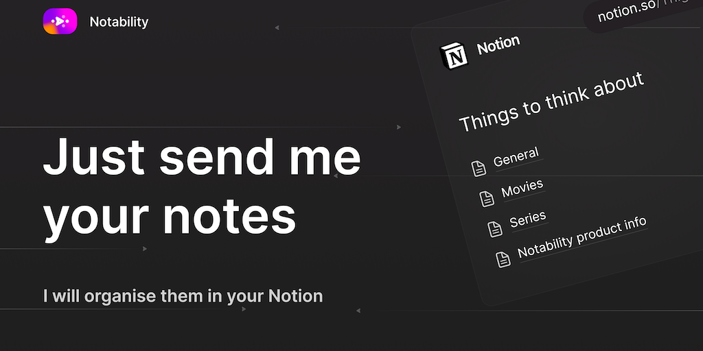 Notability is an AI chatbot that automatically organises your notes Just send your notes in Telegram and it figures where to place it in your Notion, just like a human assistant would. Never lose an i