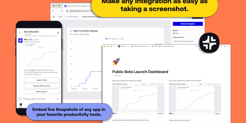 Plus is the easiest way to bring all of your team’s data wherever you need it. Take live Snapshots of any app and embed them in your favorite productivity tools. Our goal is to make any integration as