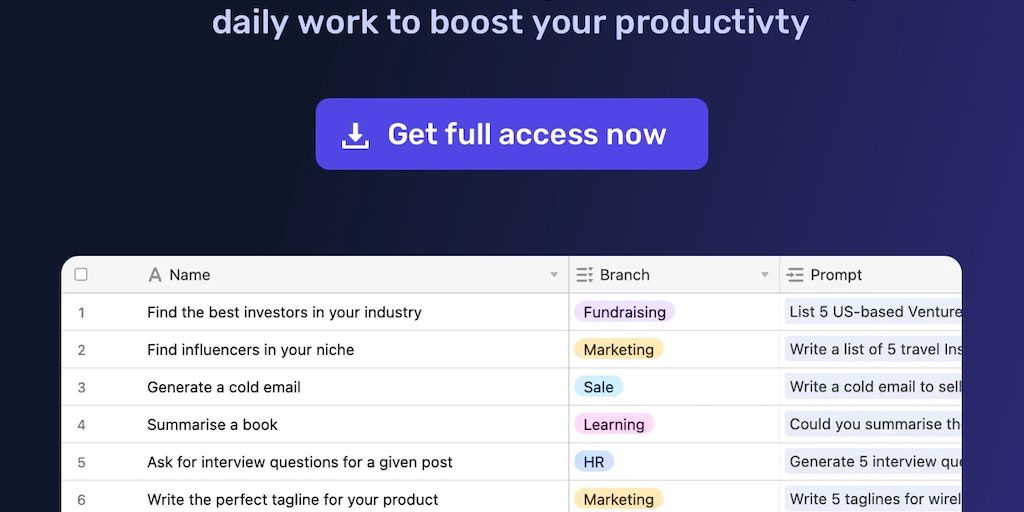 Boost your productivity with ChatGPT thanks to 100+ ChatGPT prompt inspirations tailored for entrepreneurs, marketers, sales, developers... Learn how to use ChatGPT to generate growth strategies, find