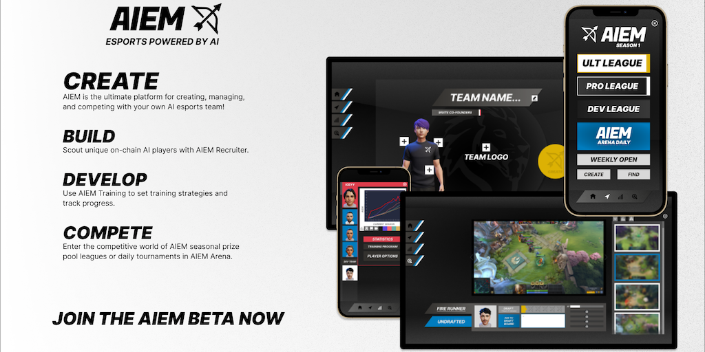 We're launching the AIEM beta in our controlled Dota 2 environment with on-chain AI players defined by unique and dynamic traits. Create, manage, and compete with your AI esports team. We welcome all