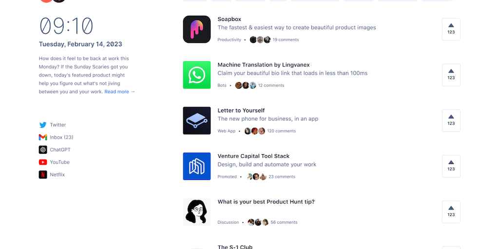 Weave discovery into your daily workflow with each new tab you open. Login to your account for a personalized view, including your latest streak. Explore top products, read about bite-sized trends, an