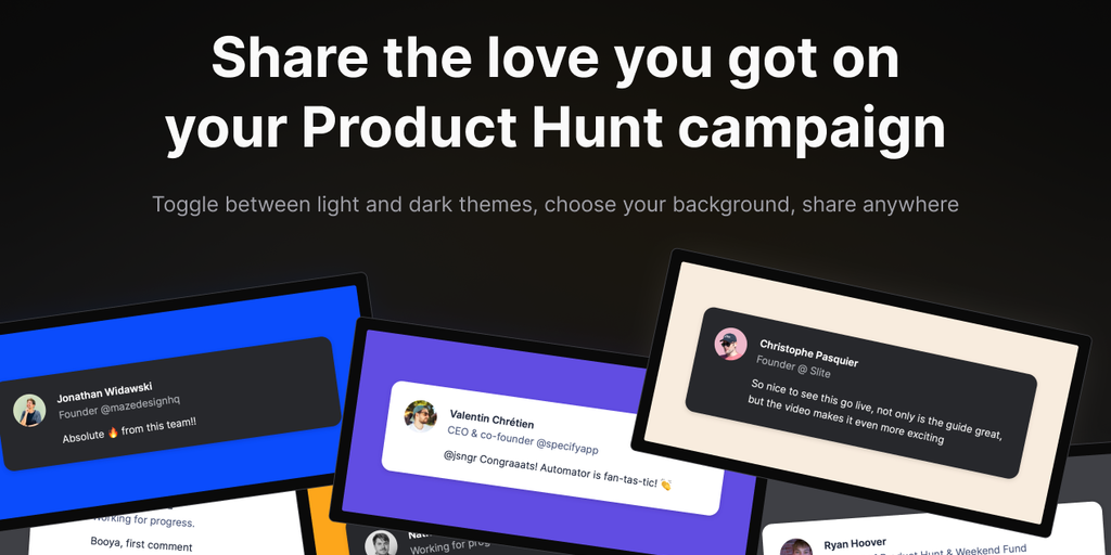 Share the love you got on your Product Hunt campaign. Toggle between light and dark themes, choose your background, share on your social medias.