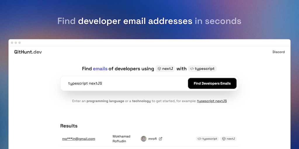 GitHunt helps you build email lists of developers based on the technologies they use. Reach prospects for your dev products, conduct market research, or source candidates in one click.