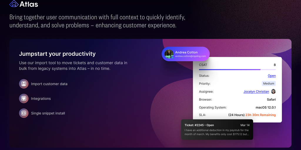 Atlas is an all-in-one customer support tool that helps agents improve the quality of their support. We do this by bringing sessions recordings, bugs, and outbound emails together in a simple customer