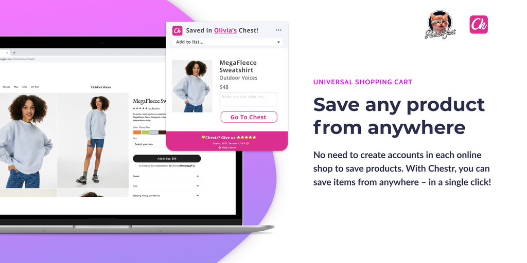 A simple, free Chrome extension that lets you save products from any online store in a single click. Plus, it notifies you anytime there's a price decrease on your saved items! Think of Chestr as a mi