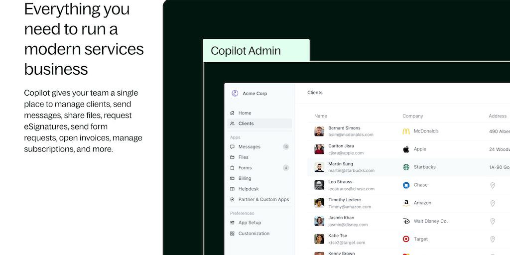 With Copilot, services businesses can set up a client portal, enabling clients to send messages, make payments, sign contracts, and access custom apps — all from one unified place.