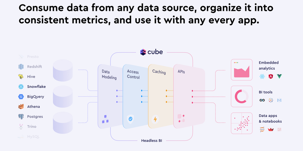 Cube is an API‑first business intelligence platform that makes data accessible and consistent across every application. Define a data model, manage security and multitenancy, accelerate queries, and e