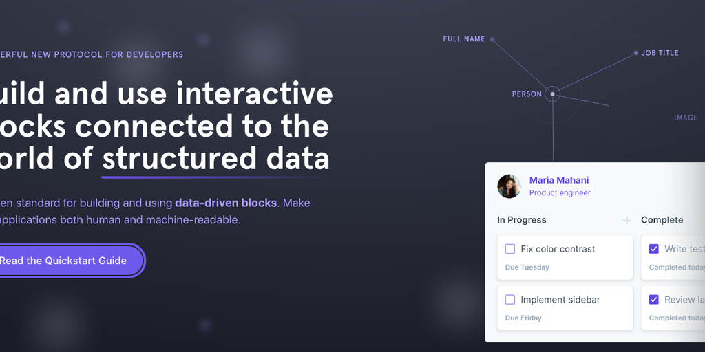 A POWERFUL NEW PROTOCOL FOR DEVELOPERS Build and use interactive blocks connected to the world of structured data An open standard for building and using data-driven blocks. Make your applications bot