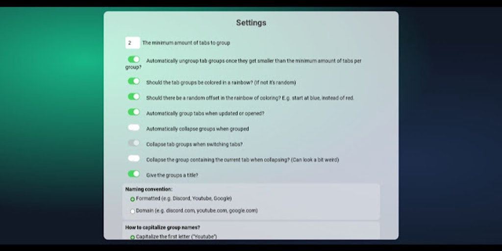 This extension allows you to automatically group tabs, manually group them, use a keyboard shortcut, customize all the options, automatically name the tab groups, you name it!