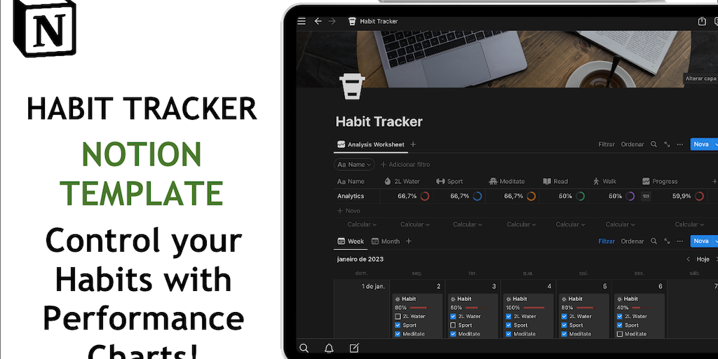 Increase the level of control of your habits with this Template for Notion! With weekly and monthly views, follow the evolution of your habits with daily charts and the entire control period!