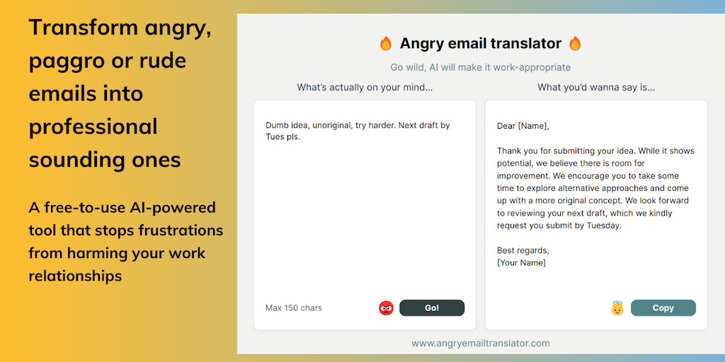 Angry Email Translator is a free AI tool that transforms your angry, paggro emails into polite and professional sounding ones. Even if you're upset at work, you can ensure your emails sound profession