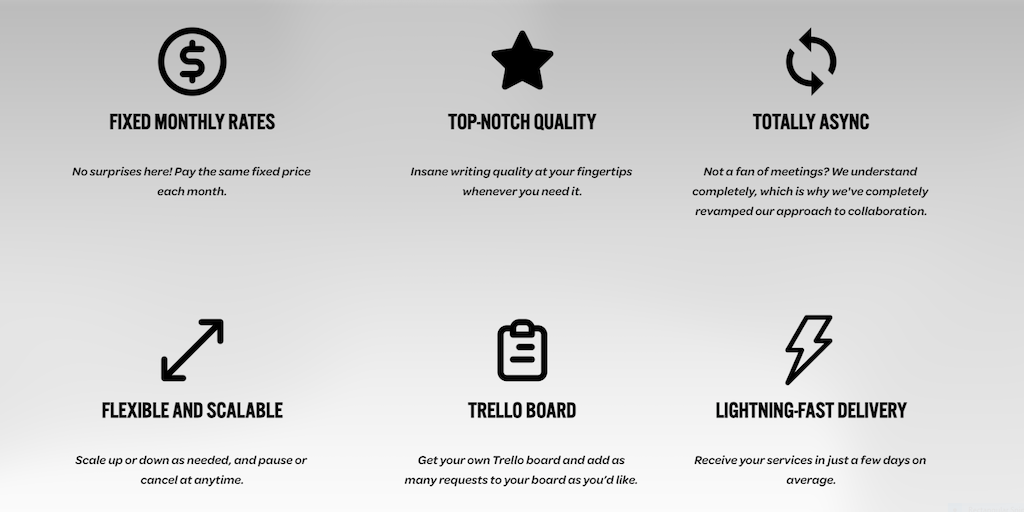 Get unlimited copywriting for one flat monthly fee - Unlimited requests & revisions - Lightning fast delivery - Unlimited brands - No contract, cancel anytime