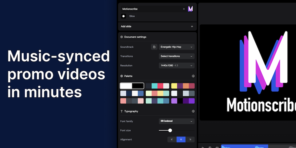 Motionscribe is a macOS app for quickly making music-synced promo videos. Tell it what colors and transitions you like, write your content, and watch the result ✨