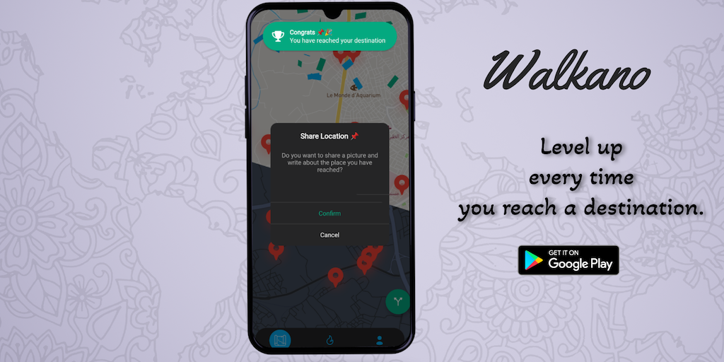 Walkano is an outdoor adventure app. Generate a set of places around you. Then try to reach one of them and share a memory of the places you have visited.