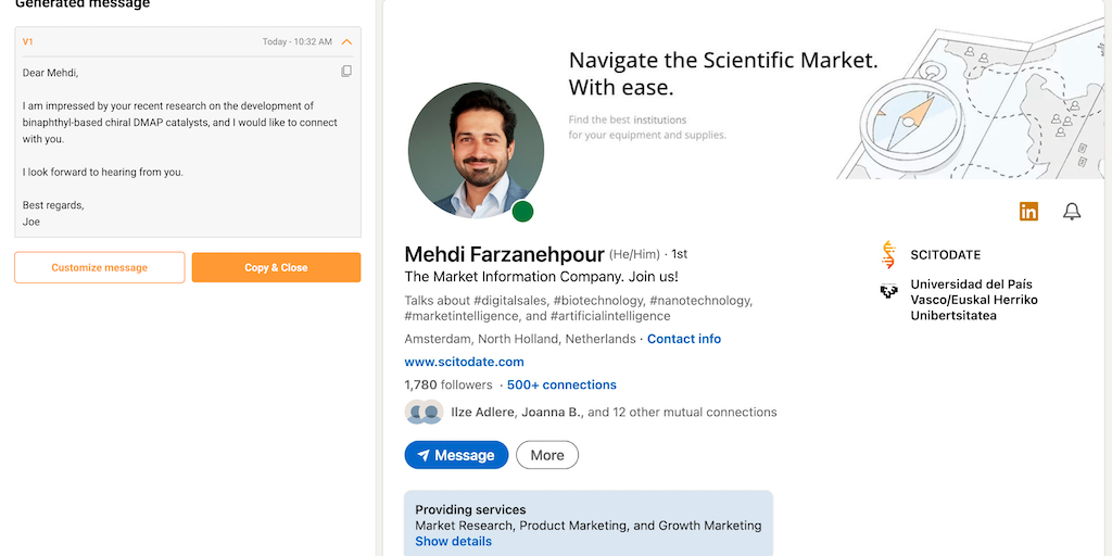 PitchGPT is a browser extension for salespeople and recruiters to generate tailored messages within seconds. Select profile properties and boost productivity with personalized messages. First 100 mess