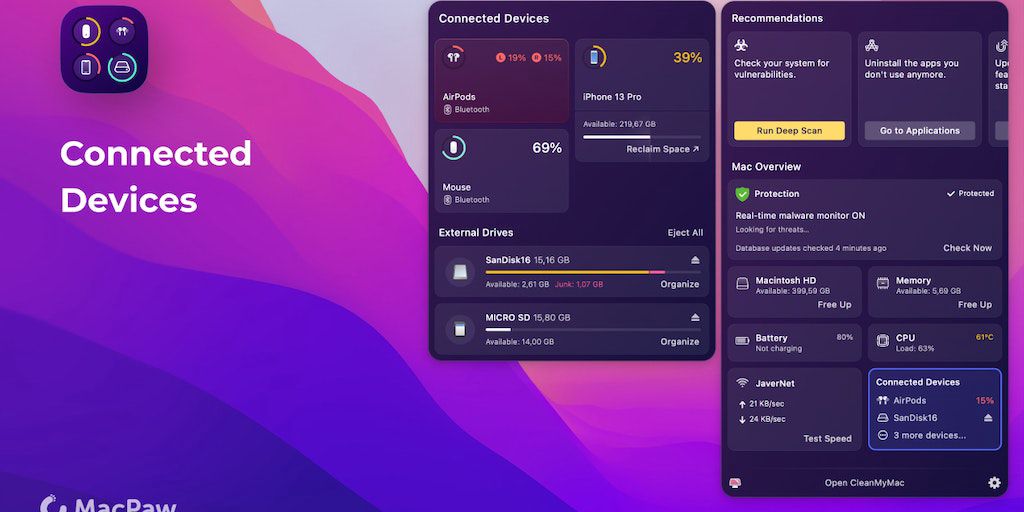 Meet Connected Devices — the new monitor that lives in CleanMyMac’s Menu app. Get detailed info on all devices connected to your Mac via WiFi, Bluetooth, or USB, and declutter your external drives in