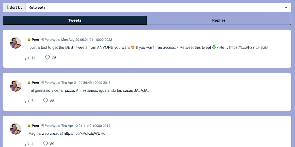 Get a list of the best tweets of your favourite Twitter accounts and sort them by likes or retweets. The best way to crush it on Twitter is by getting inspired by all the amazing existing accounts. Lo