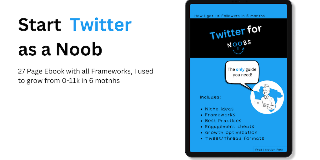 Twitter for Noobs is an all-in-one Growth Framework, that I used to grow from 0-11k Followers in 6 months. It's a skip-the-line ebook focussing on the core elements with essential resources. Grow your