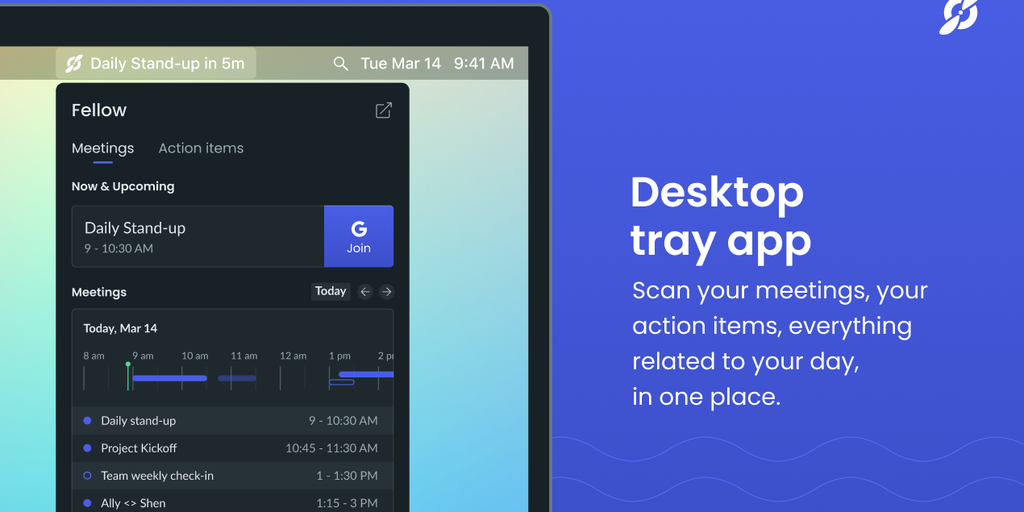 Fellow’s Desktop tray app makes managing your day that much easier. ✨ You can effortlessly join meetings, view your meeting schedule, access meeting notes and manage action items right from your
