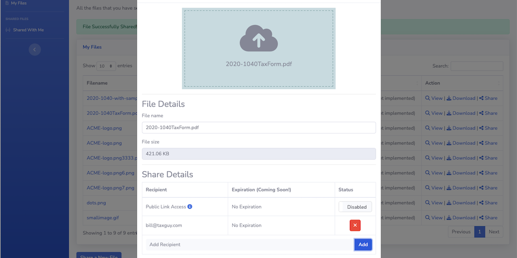 Share personal documents and files safely and securely. SendSecurely features end-to-end encryption, fully configurable access control lists (ACLs), and comprehensive auditing of file access - all bac