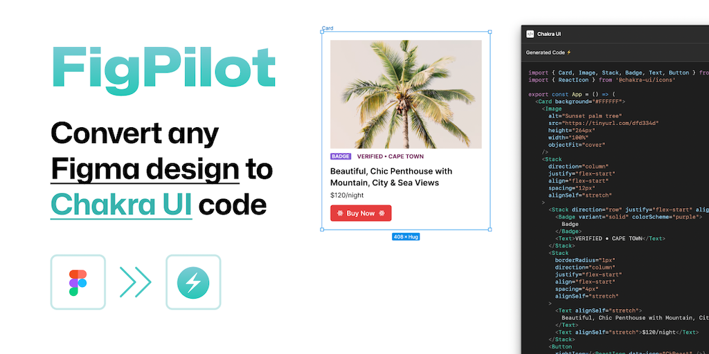 FigPilot is a Figma plugin that helps teams launch 10x faster by converting designs into production-ready Chakra UI code in two simple steps: 🎨 Create a design in Figma 🪄 Generate the code in a click