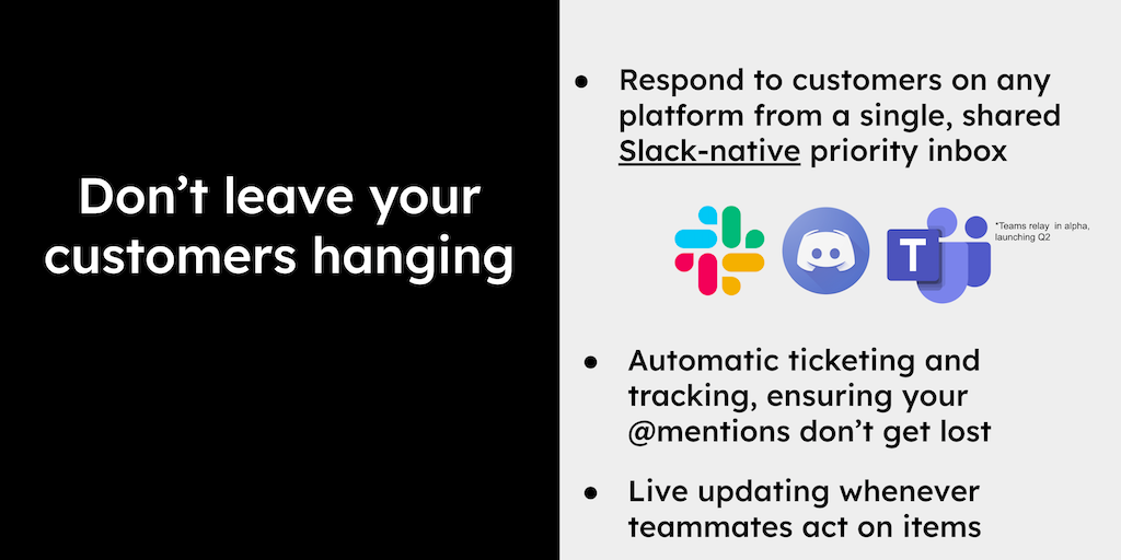 Today's best sales and customer success orgs use shared channels to great effect. Relay solves the scaling problems with our Slack-native priority inbox, like Front for Slack Connect. Our integrations