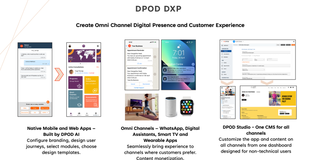 DPOD DXP is an omni-channel digital experience SaaS platform for health and wellness business. Grow your business 10x with branded mobile apps, progressive website and WhatsApp channels. Integrate mar