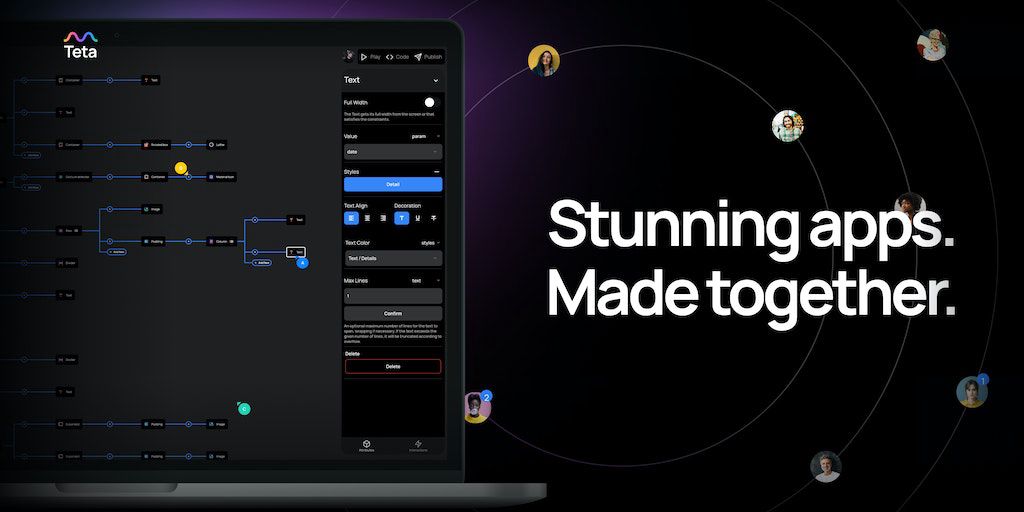 Teta is a no-code tool that allows building apps effortlessly. Innovative, advanced for pros and teams, and easy for everyone. With the Beta we introduce In-App purchases & subs, maps, audio player, a