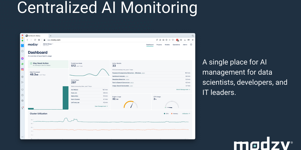 The Modzy ModelOps platform accelerates the deployment, integration, and governance of production-ready AI. Supported by a growing community of data scientists and developers, Modzy solves the toughes