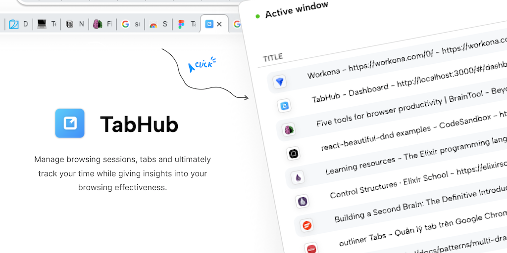 TabHub is a next-generation tab manager. Manage tabs, sessions, track your online productivity and reduce memory usage. Collaborate with features such as Workspace and Explore. Stay tuned!