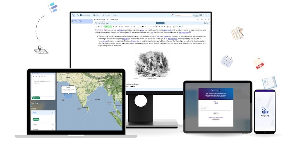 Waspnote: Elevate note-taking with maps, events, timelines, YouTube timestamps, OCR, custom dictionary, AI summaries, ebook/PDF integration, and easy sharing/exporting. Perfect for students and profes