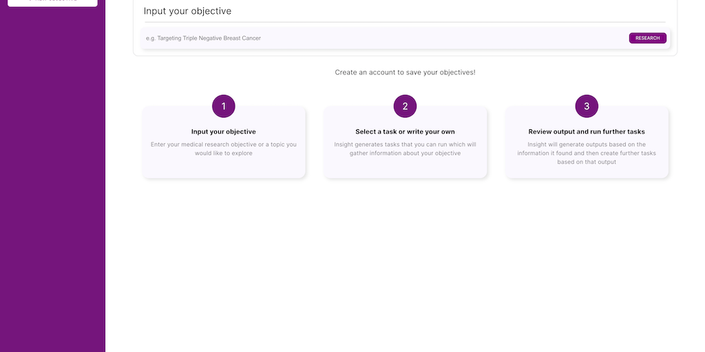 Insight is an Autonomous Agent that can do medical research! Just put in your objective, click research, and use Insight's incredibly power interface to do medical research in minutes! (and it actuall
