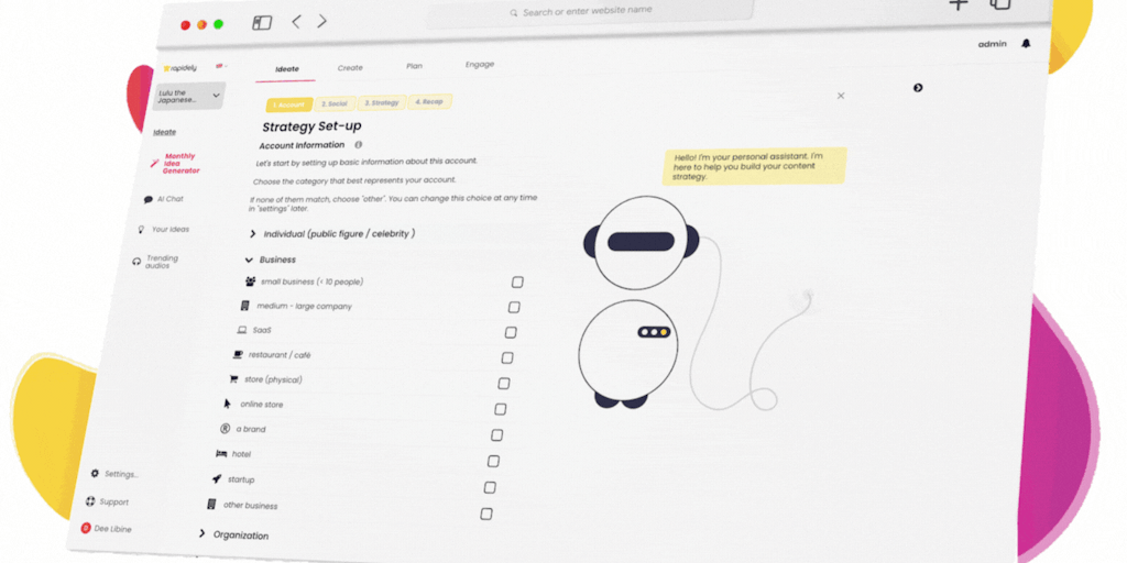 Meet Rapidely, your AI assistant for social media management. It's designed to support you in creating your tailored strategy, generating custom content ideas, crafting captions, designing carousels,