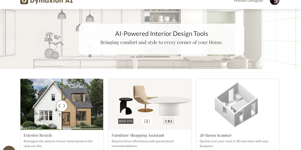 Transform your space with Dymaxion Design's AI tools! ✨ Instantly restyle your home's exterior, find the perfect furniture with custom preferences (budget, style, size), and scan rooms in 3D for preci