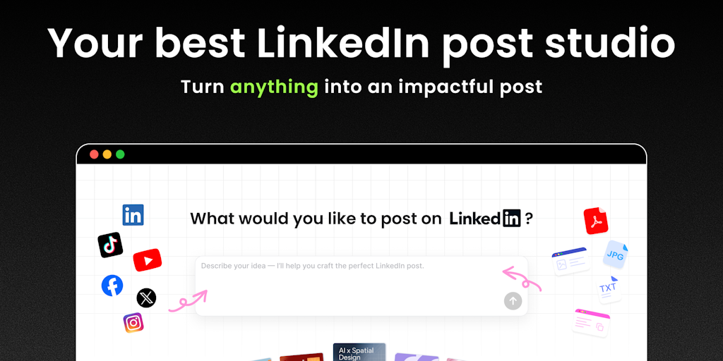 Turn ideas, links, PDFs, and images into ready-to-post LinkedIn posts in minutes. Dynal learns your tone and uses proven patterns to draft editable copy and visuals, making it easier to post consisten