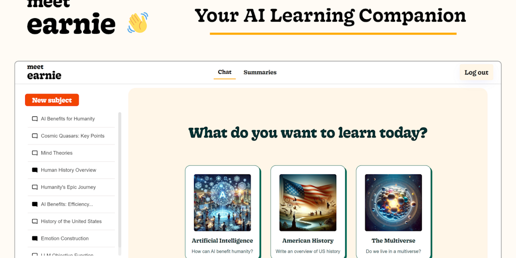 An AI designed to fuel your desire to learn. Earnie goes beyond conversation with powerful AI features like personalized summaries, custom suggestions, interactive quizzes, and much more, to help you