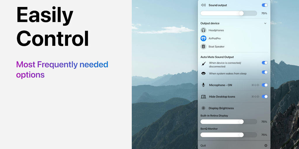 Easily is a lightweight Mac utility that lets you auto-mute audio, switch sound outputs, hide desktop icons, and control brightness on all displays — even external ones. Stay focused, clutter-free, an