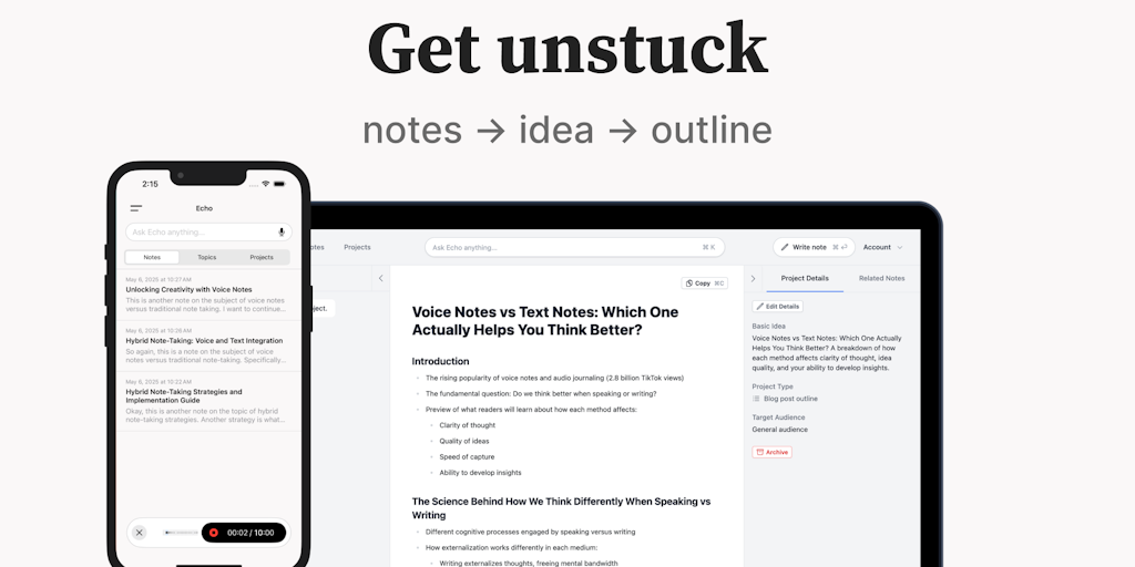 Capture messy thoughts and shape them into outlines, without breaking your flow. Echo Projects uses AI to guide your thinking, not do it for you.
