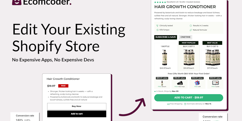 Meet Ecomcoder, the easiest way for Shopify store owners to create high-converting designs and content directly within Shopify’s own theme system. No external builders, plugins, or complicated integra